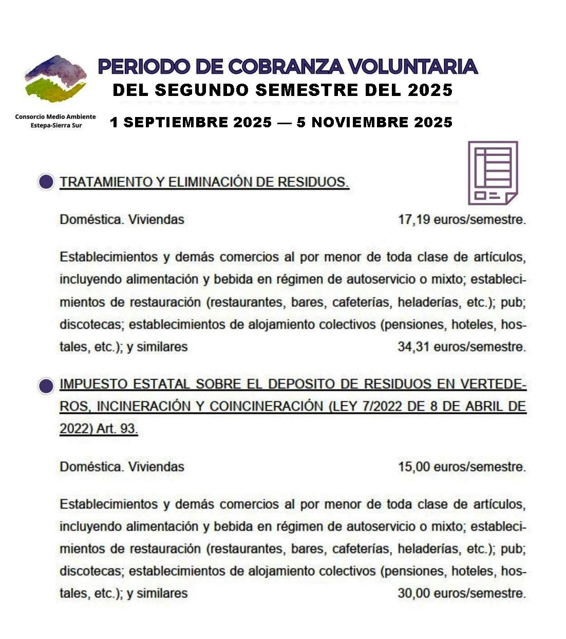 El Consorcio de Medio Ambiente Estepa-Sierra Sur informa de que ya está en marcha el periodo de cobranza voluntaria de los recibos correspondientes a las tasas por tratamiento y eliminación de residuos del segundo semestre del año 2025.