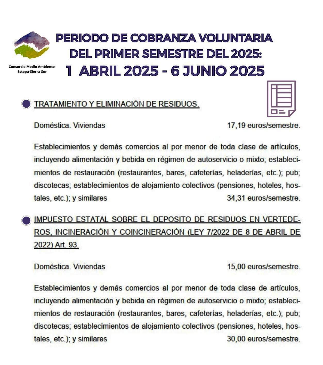 El Consorcio de Medio Ambiente Estepa-Sierra Sur informa que el pago de los tributos correspondientes a las tasas por tratamiento y eliminación de residuos del primer semestre del 2025 podrá hacerse en periodo voluntario del 1 de abril al 6 de junio.